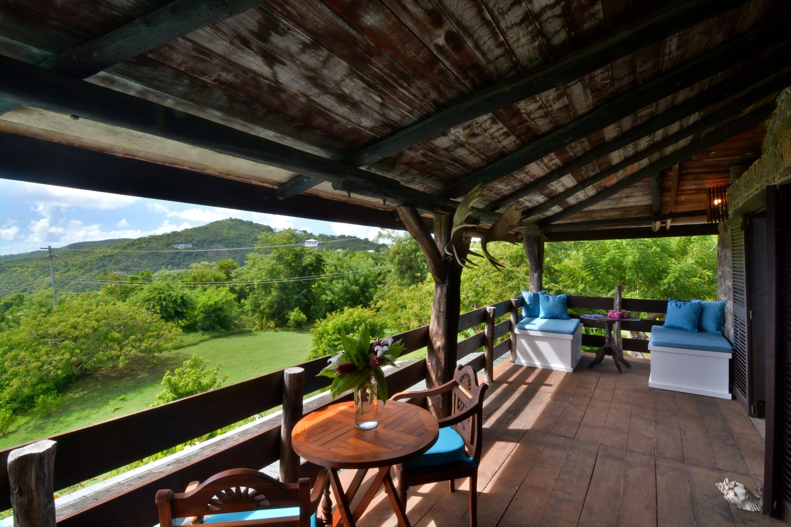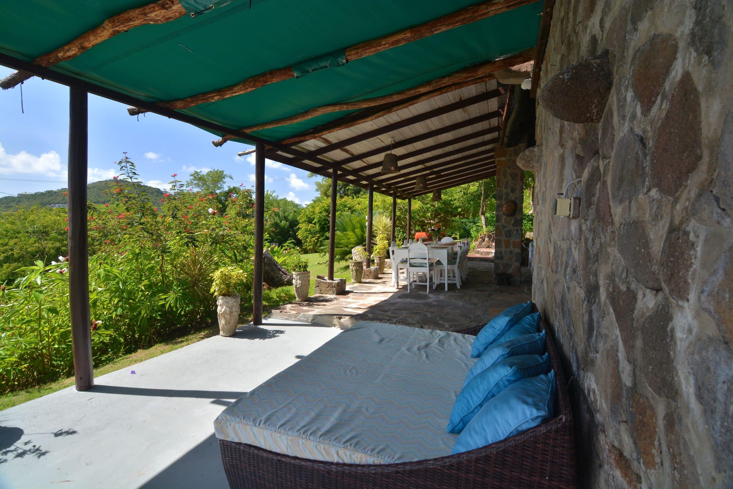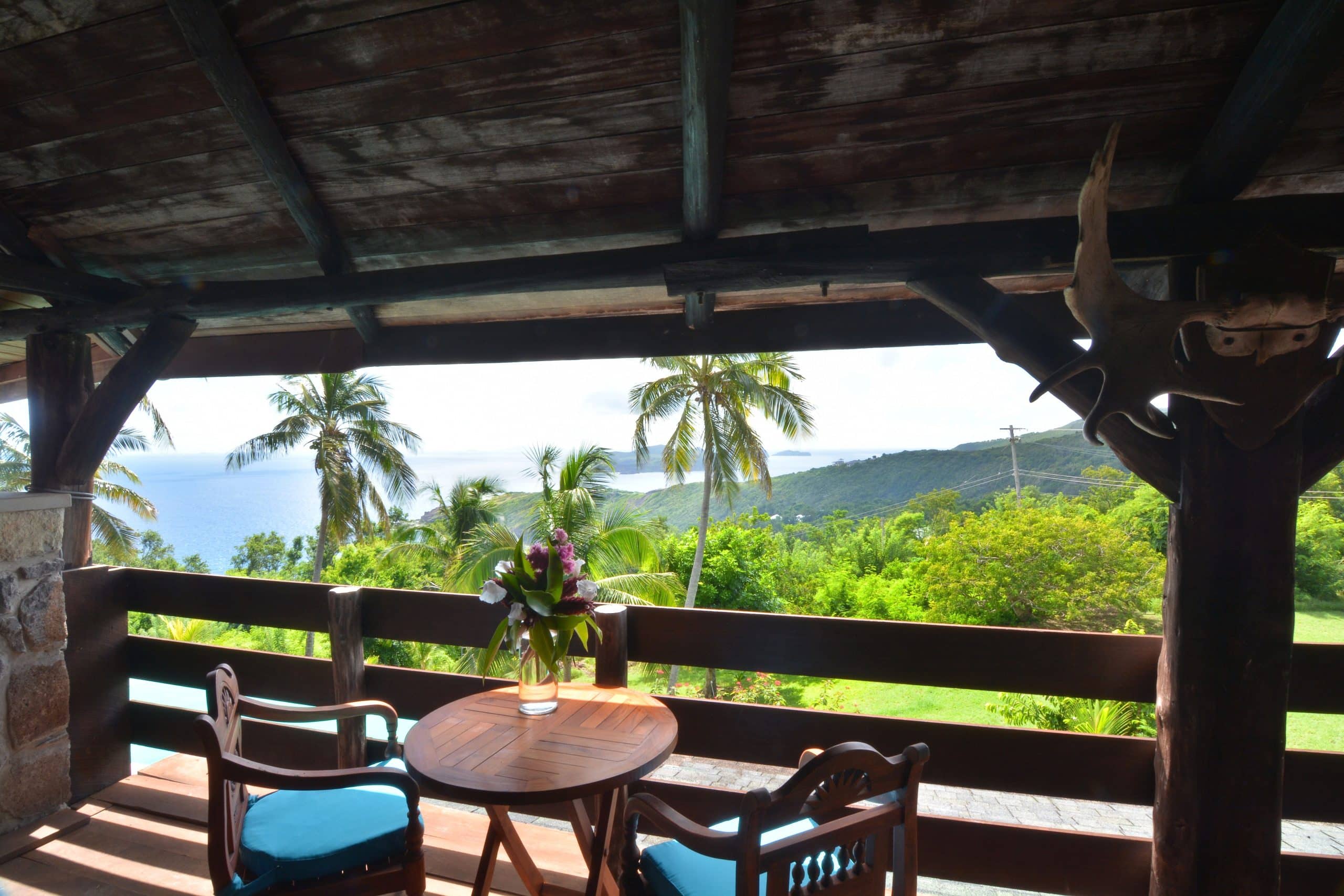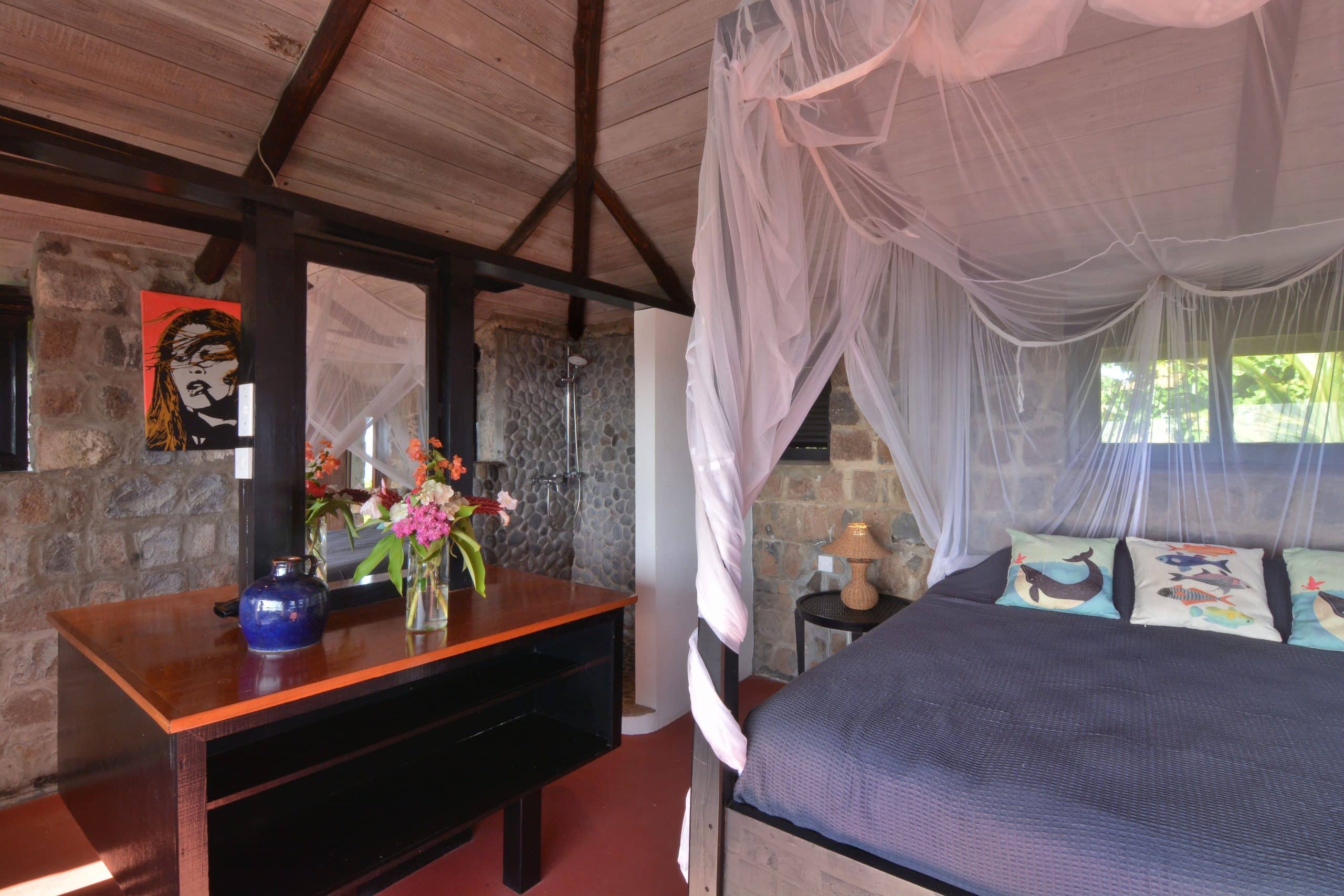 A fifth suite is in a separate building above the outdoor bar and pool area. It features a queen-sized bed with an en-suite bathroom and a private balcony with views of the Grenadine Islands, including Grenada, on a clear day. This room has a fan.