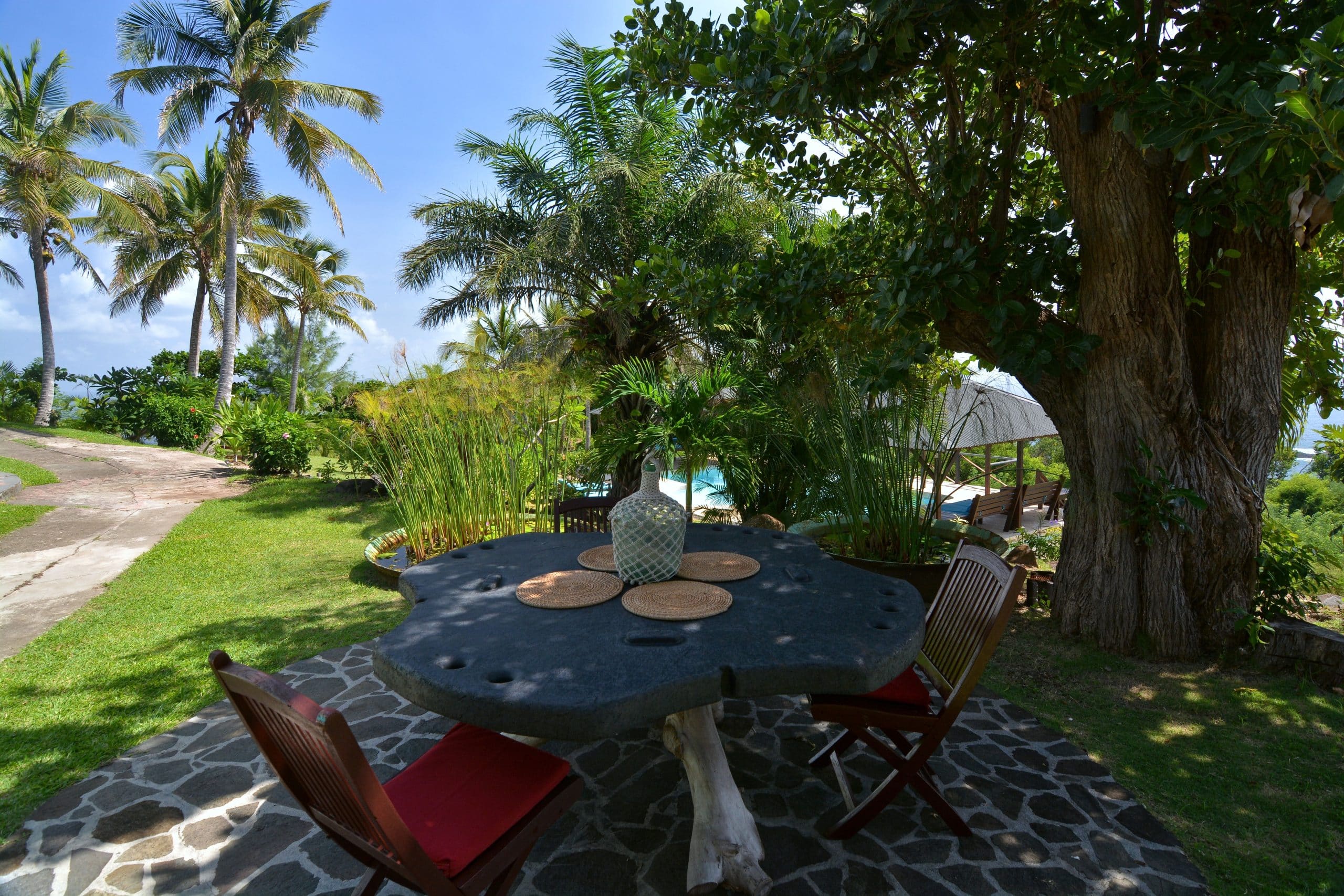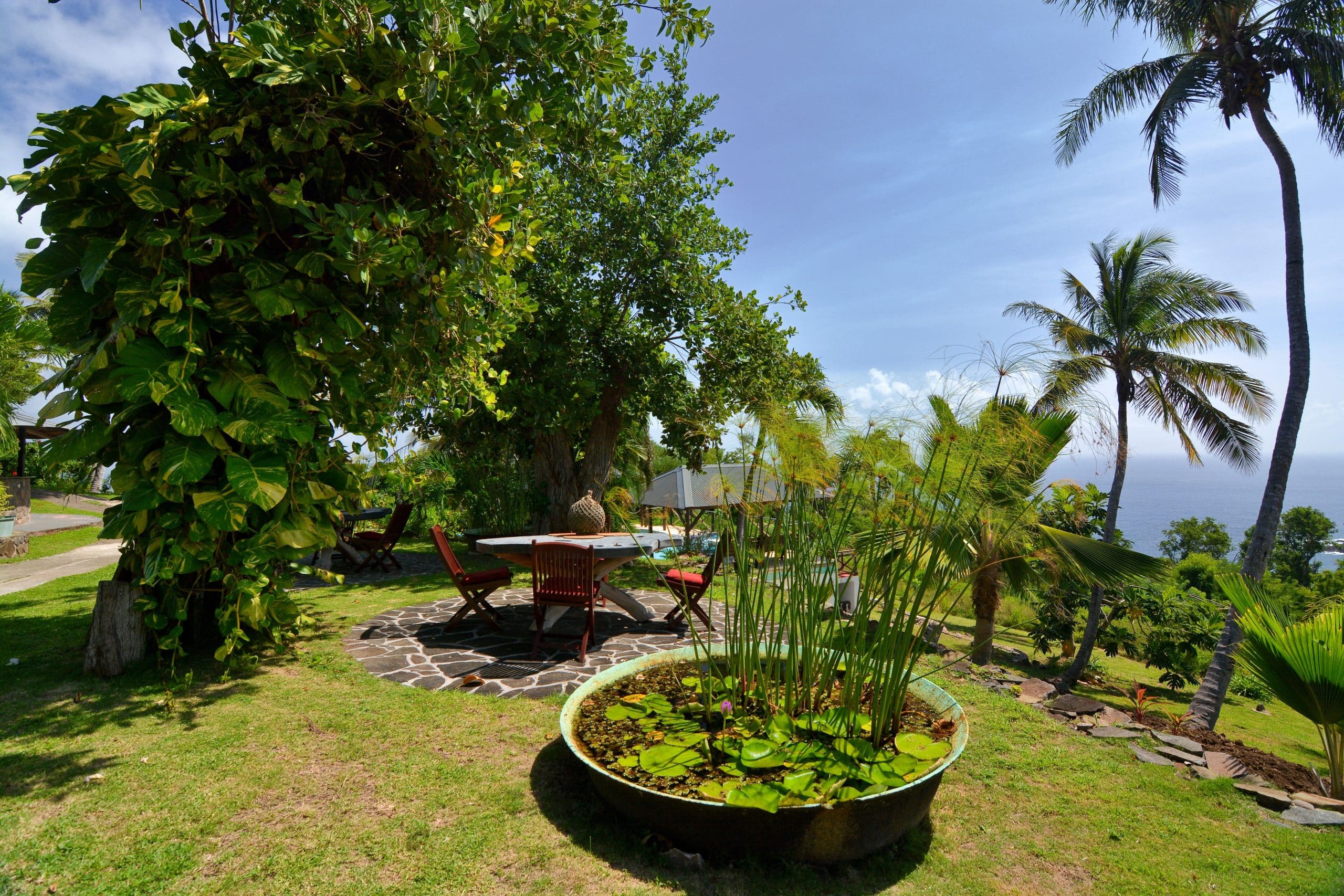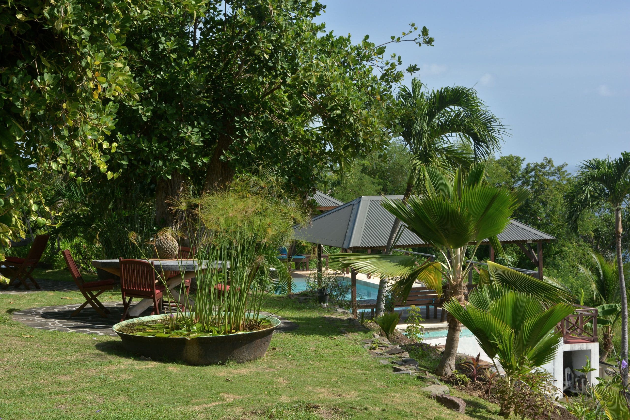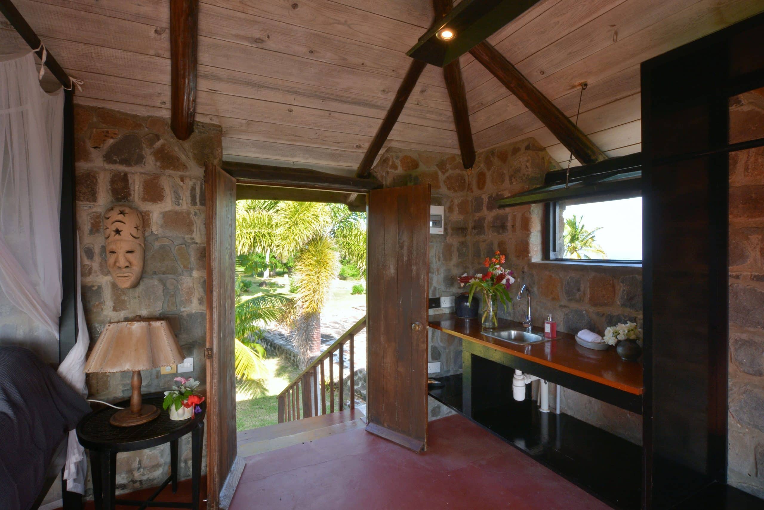 A fifth suite is in a separate building above the outdoor bar and pool area. It features a queen-sized bed with an en-suite bathroom and a private balcony with views of the Grenadine Islands, including Grenada, on a clear day. This room has a fan.
