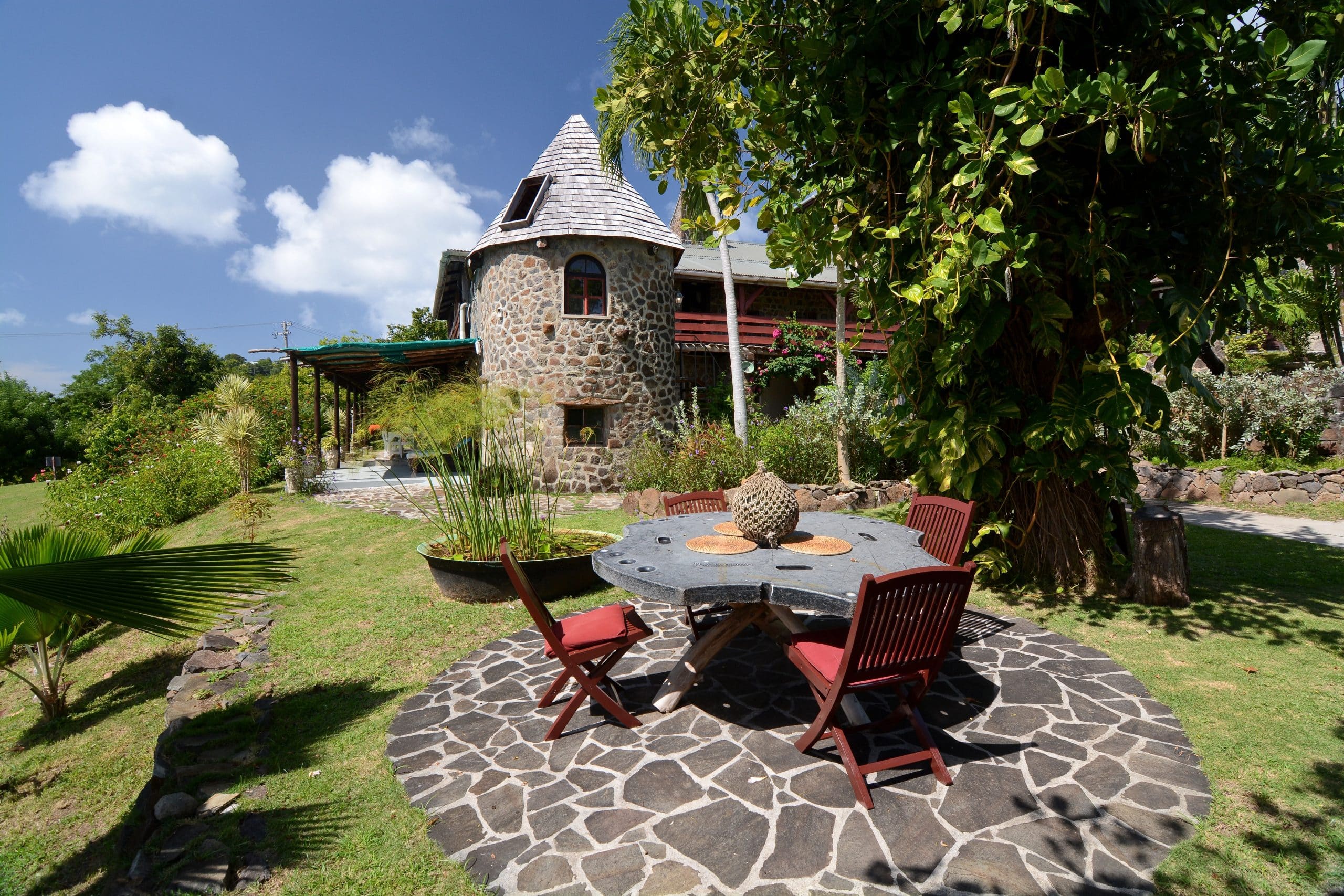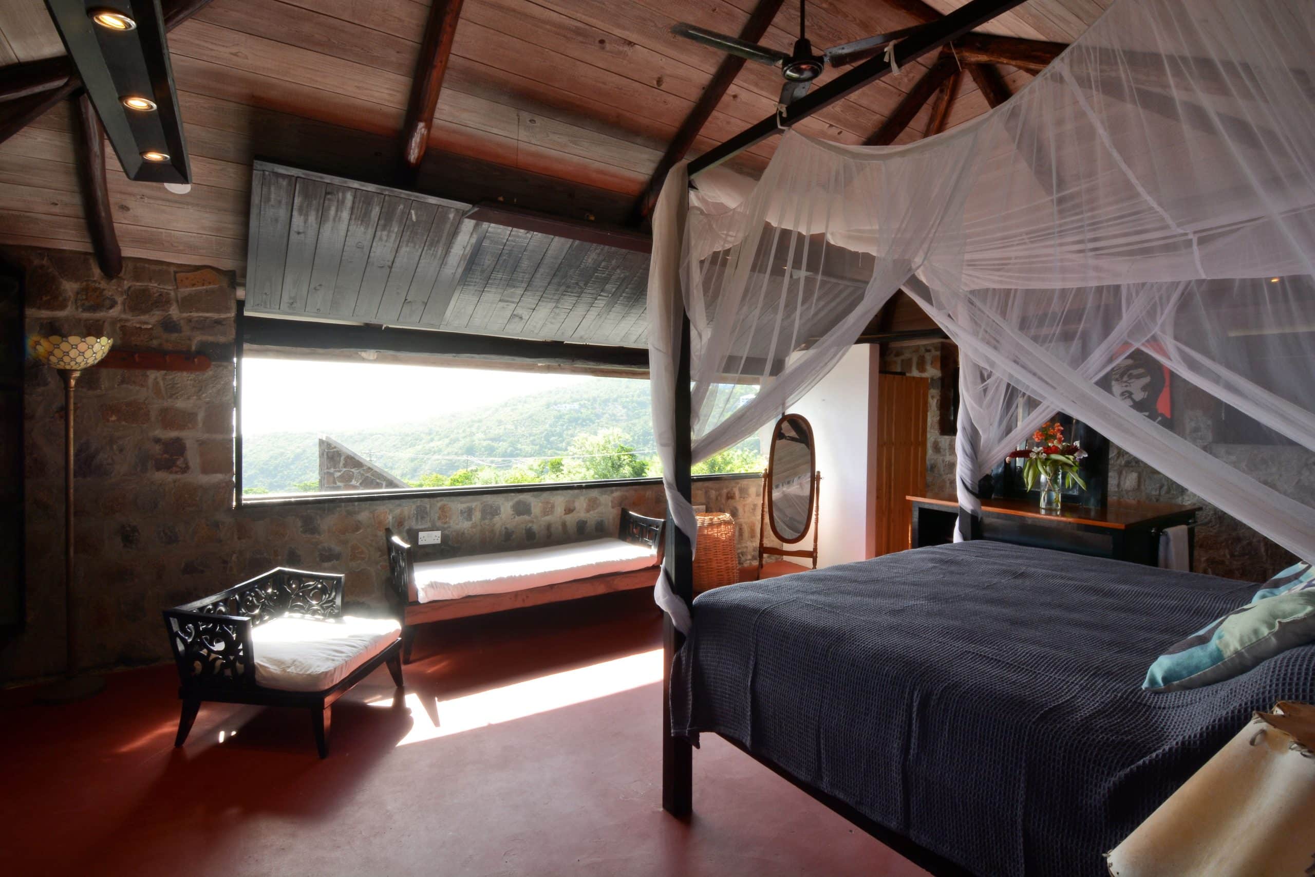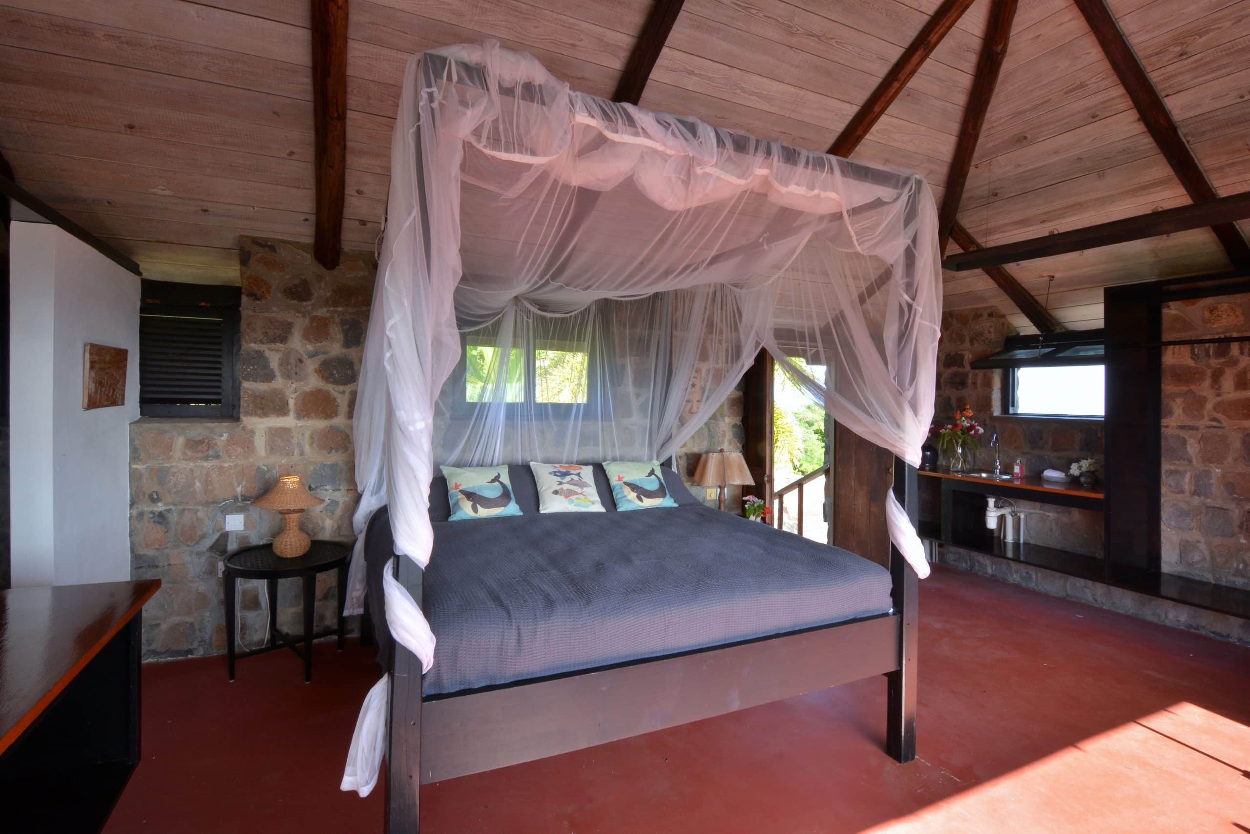 A second suite at the top of the central tower offers breathtaking 360-degree views through its many windows. This king-sized four-poster bed suite also has a sofa, an en-suite bathroom with an open pebbled shower, and a ceiling fan to keep the room cool. Wake up with all the Grenadine Islands in view.