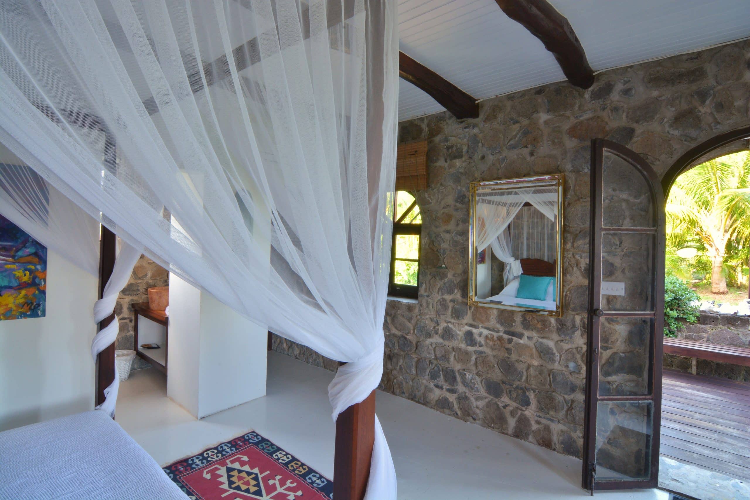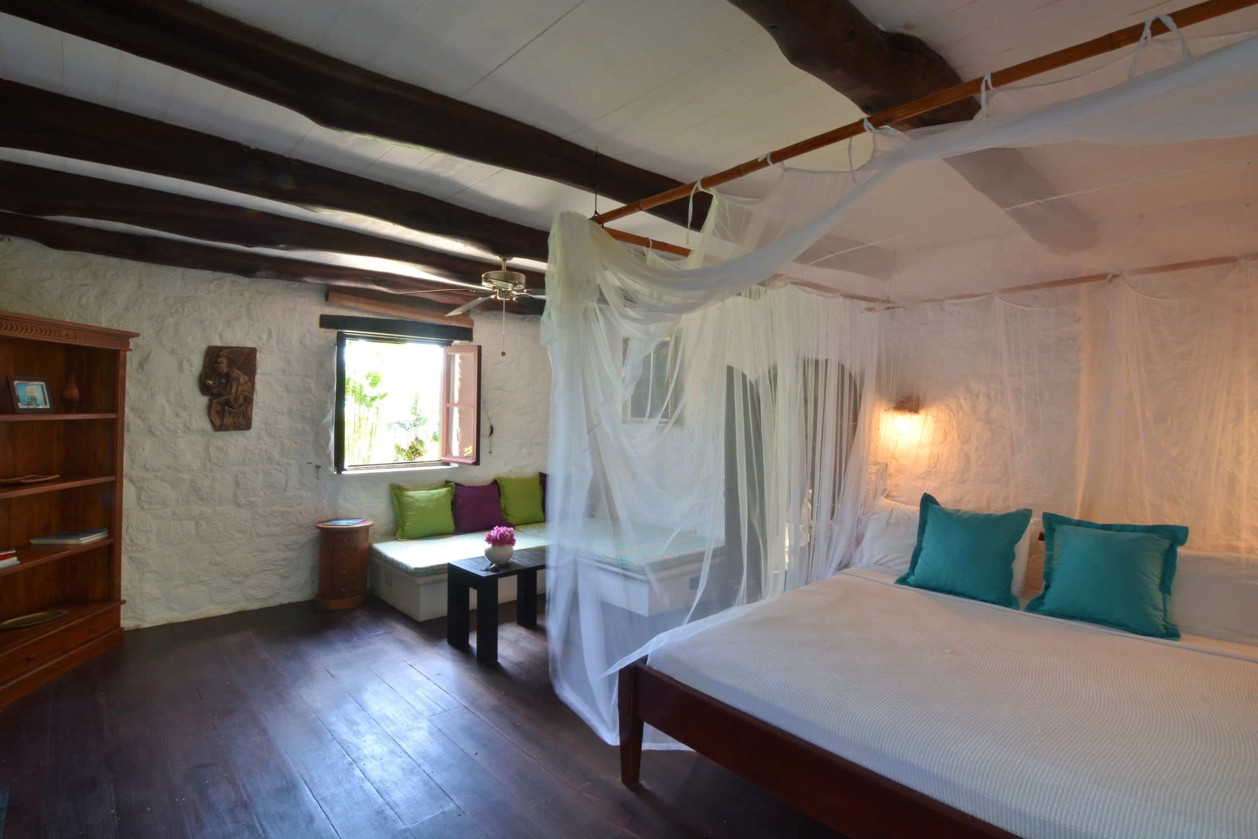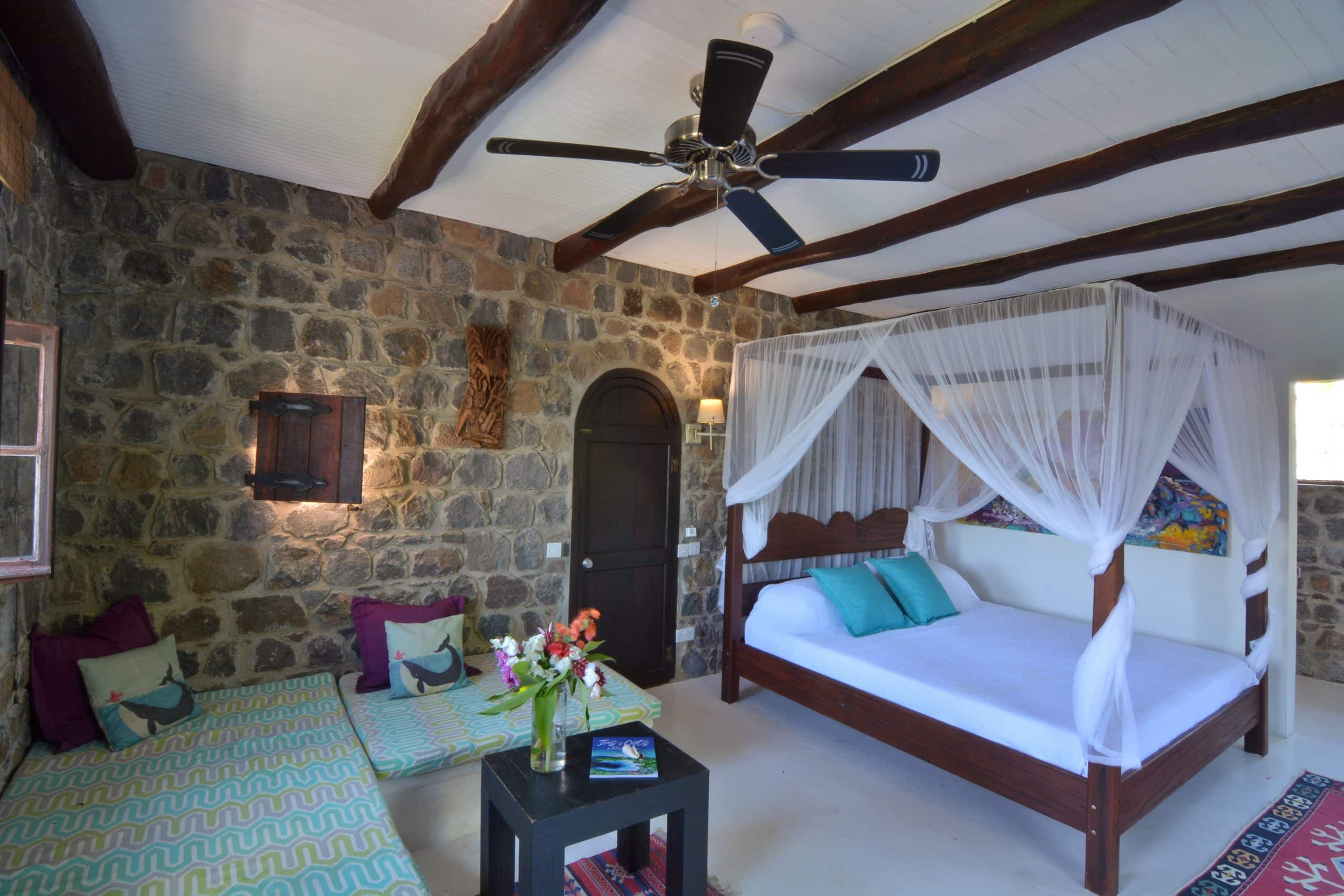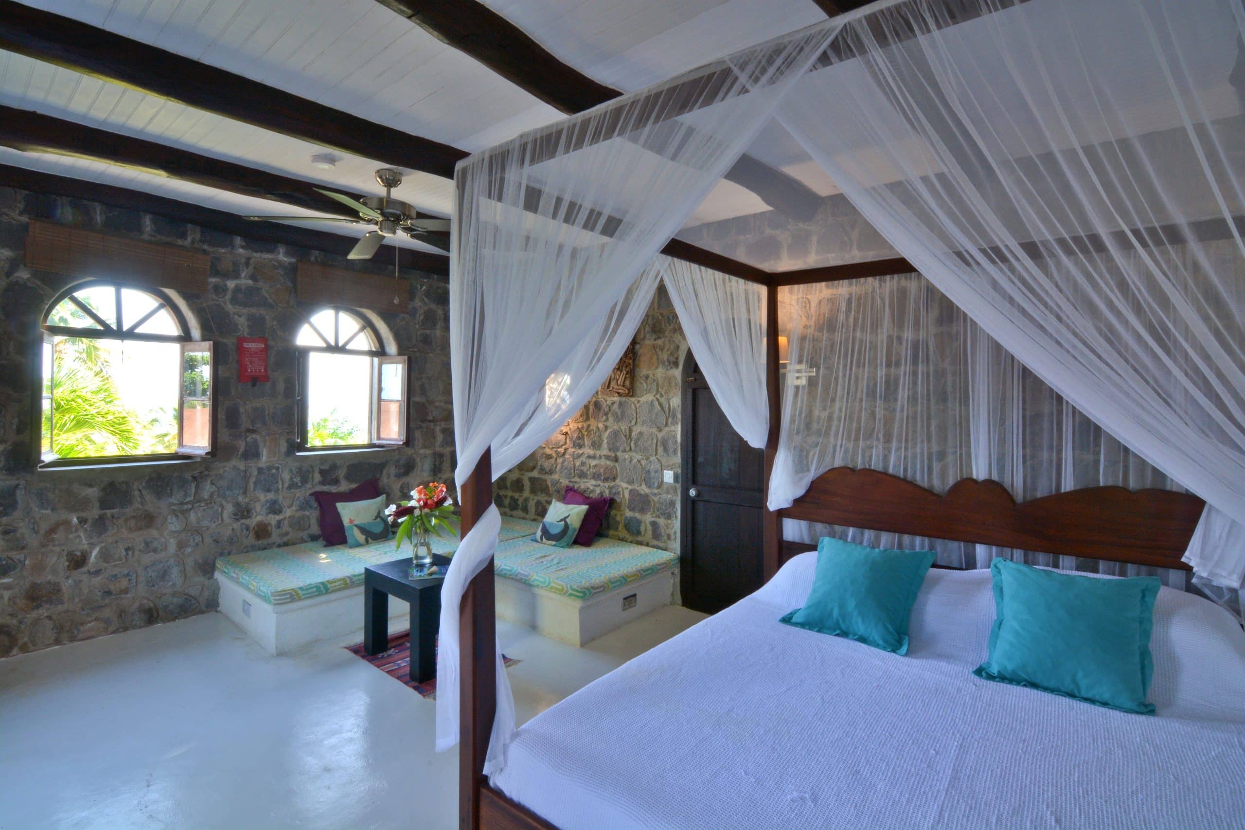 Five uniquely styled suites comfortably accommodate 12 guests. Two of the bedrooms are air-conditioned, the remaining rooms are very open and take advantage of the natural atlantic breezes. The two-bedroom primary suite is located on the second floor of the Old Fort building. This spacious suite features a large bedroom with a king-sized four-poster bed a second bedroom with a queen bed), a custom-designed bathroom with a pebbled bathtub, and a sitting room with a library. The suite boasts beautiful hardwood floors, high arched hardwood ceilings with ceiling fans, and two balconies with stunning views of the estate and the surrounding islands. This room has windows on two sides and is very open so have a wonderful breeze, this room does not have air conditioning