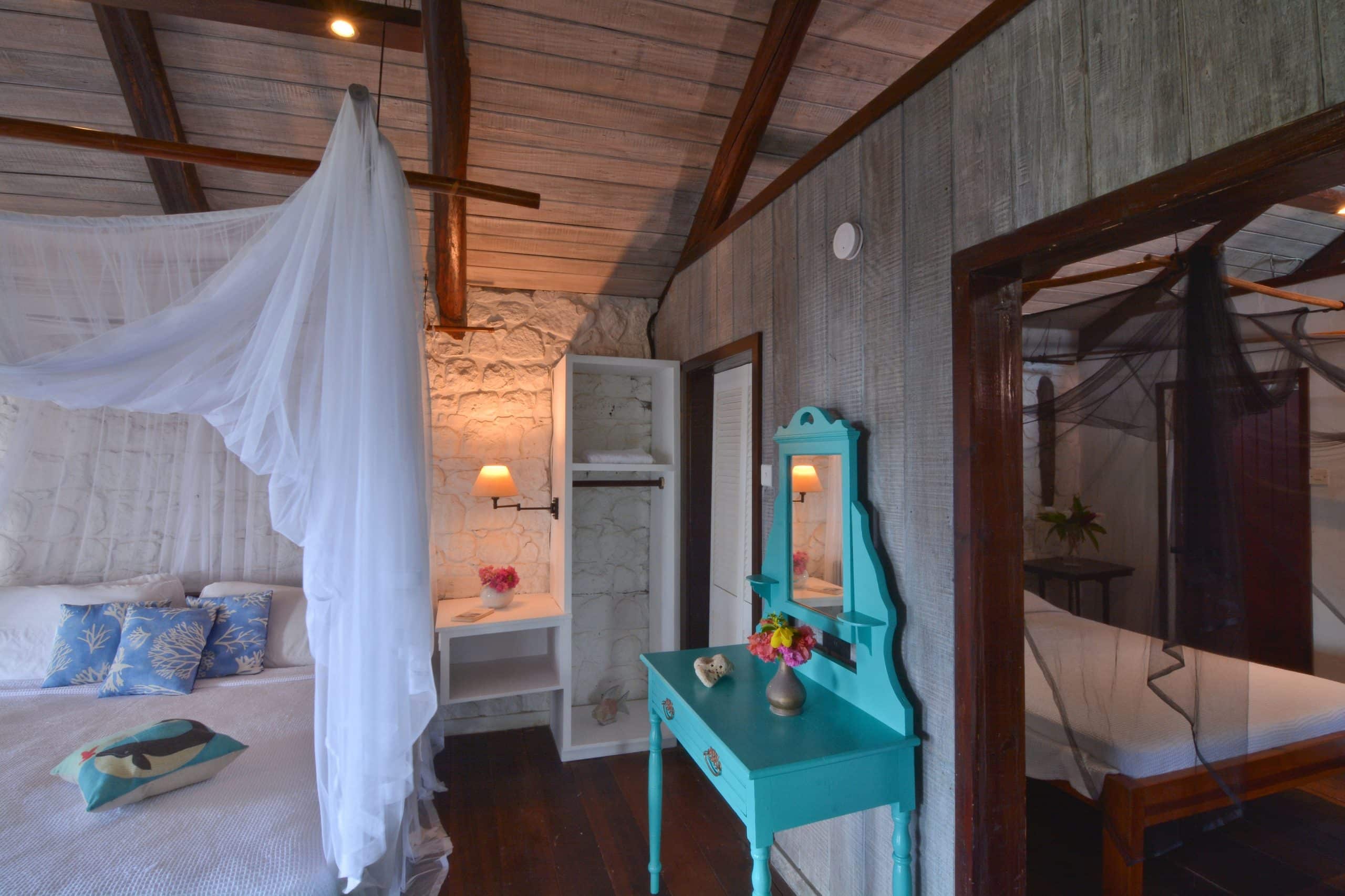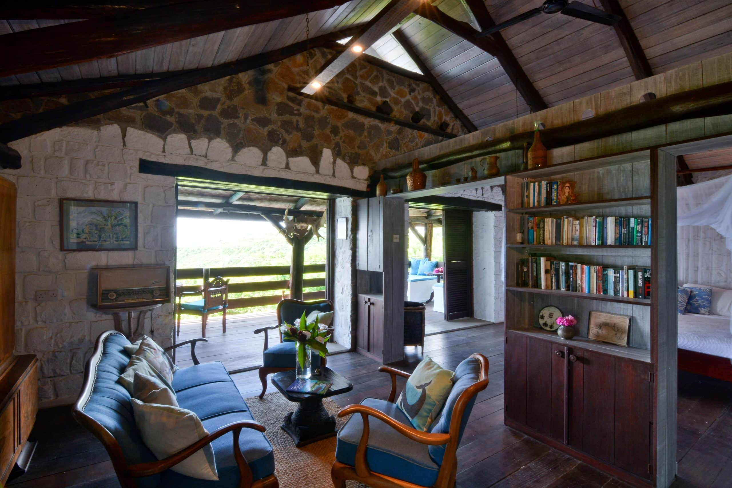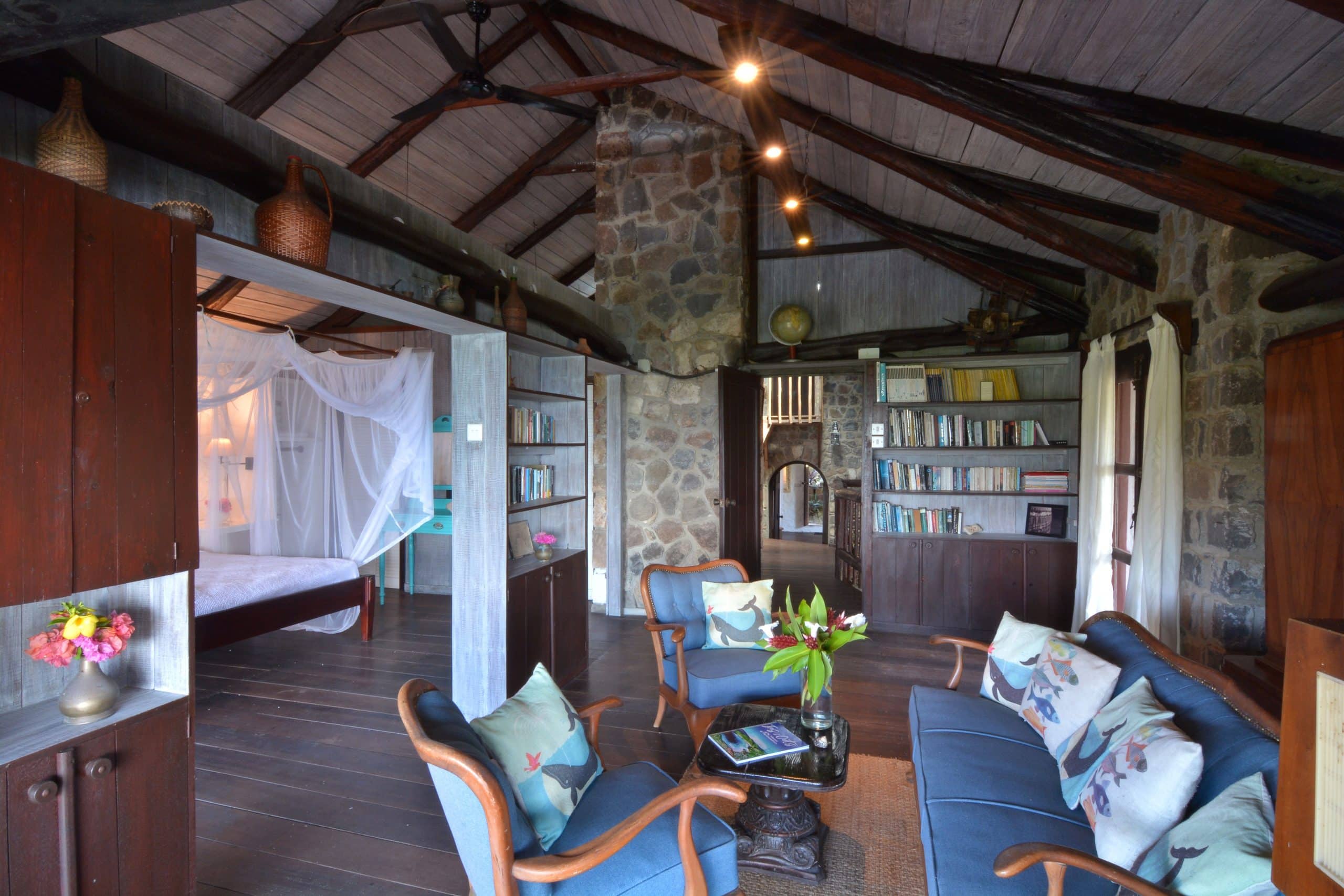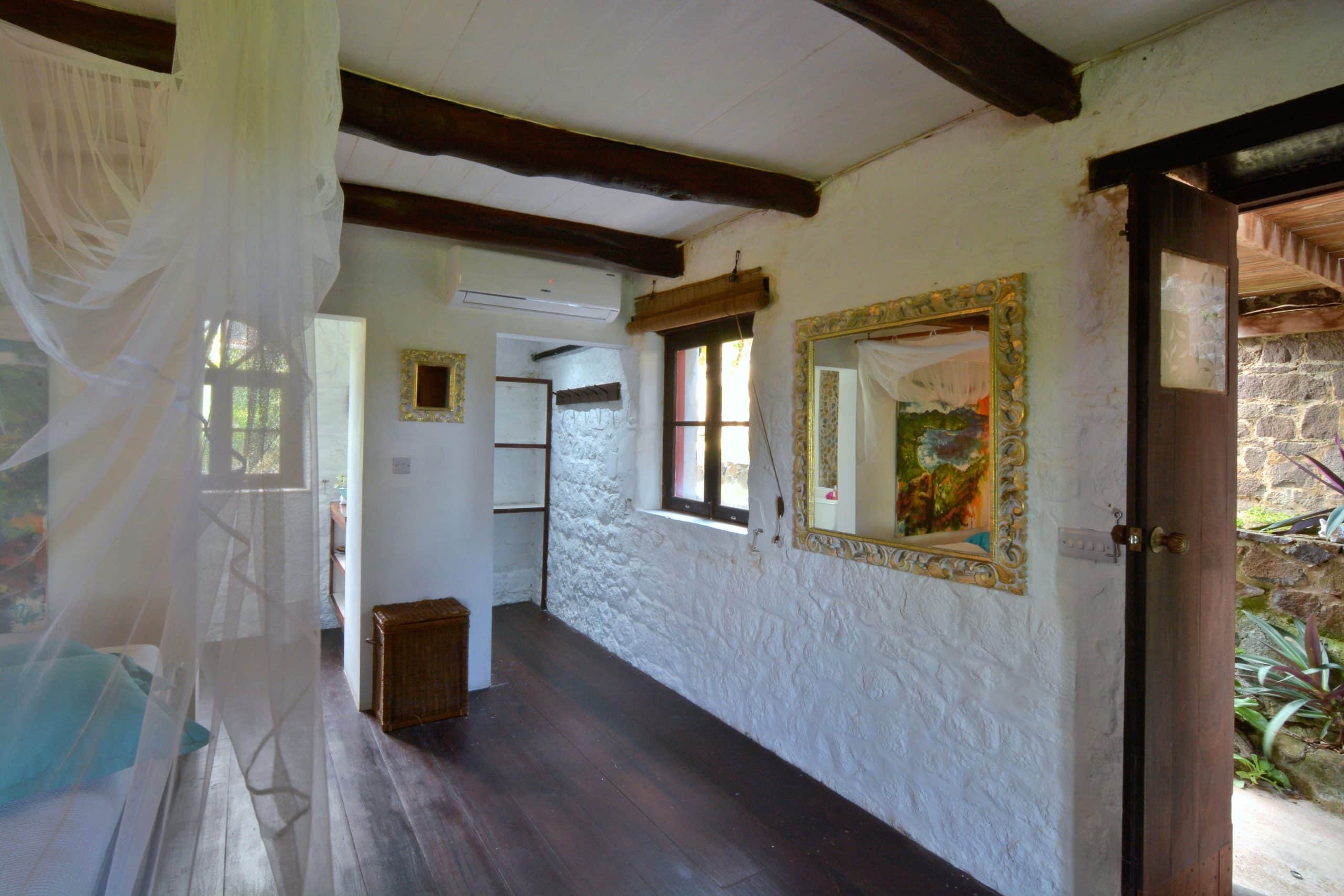 Five uniquely styled suites comfortably accommodate 12 guests. Two of the bedrooms are air-conditioned, the remaining rooms are very open and take advantage of the natural atlantic breezes. The two-bedroom primary suite is located on the second floor of the Old Fort building. This spacious suite features a large bedroom with a king-sized four-poster bed a second bedroom with a queen bed), a custom-designed bathroom with a pebbled bathtub, and a sitting room with a library. The suite boasts beautiful hardwood floors, high arched hardwood ceilings with ceiling fans, and two balconies with stunning views of the estate and the surrounding islands. This room has windows on two sides and is very open so have a wonderful breeze, this room does not have air conditioning
