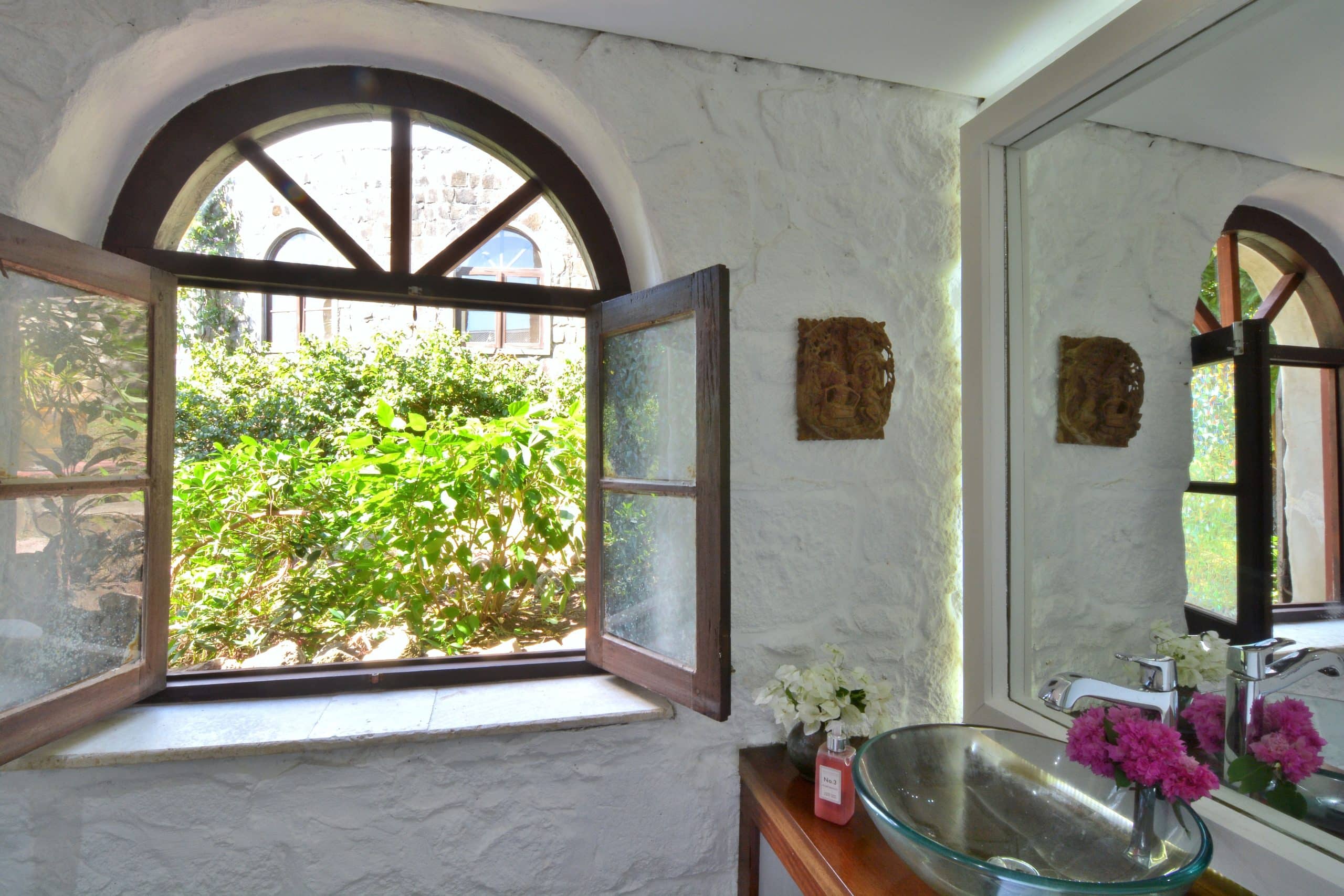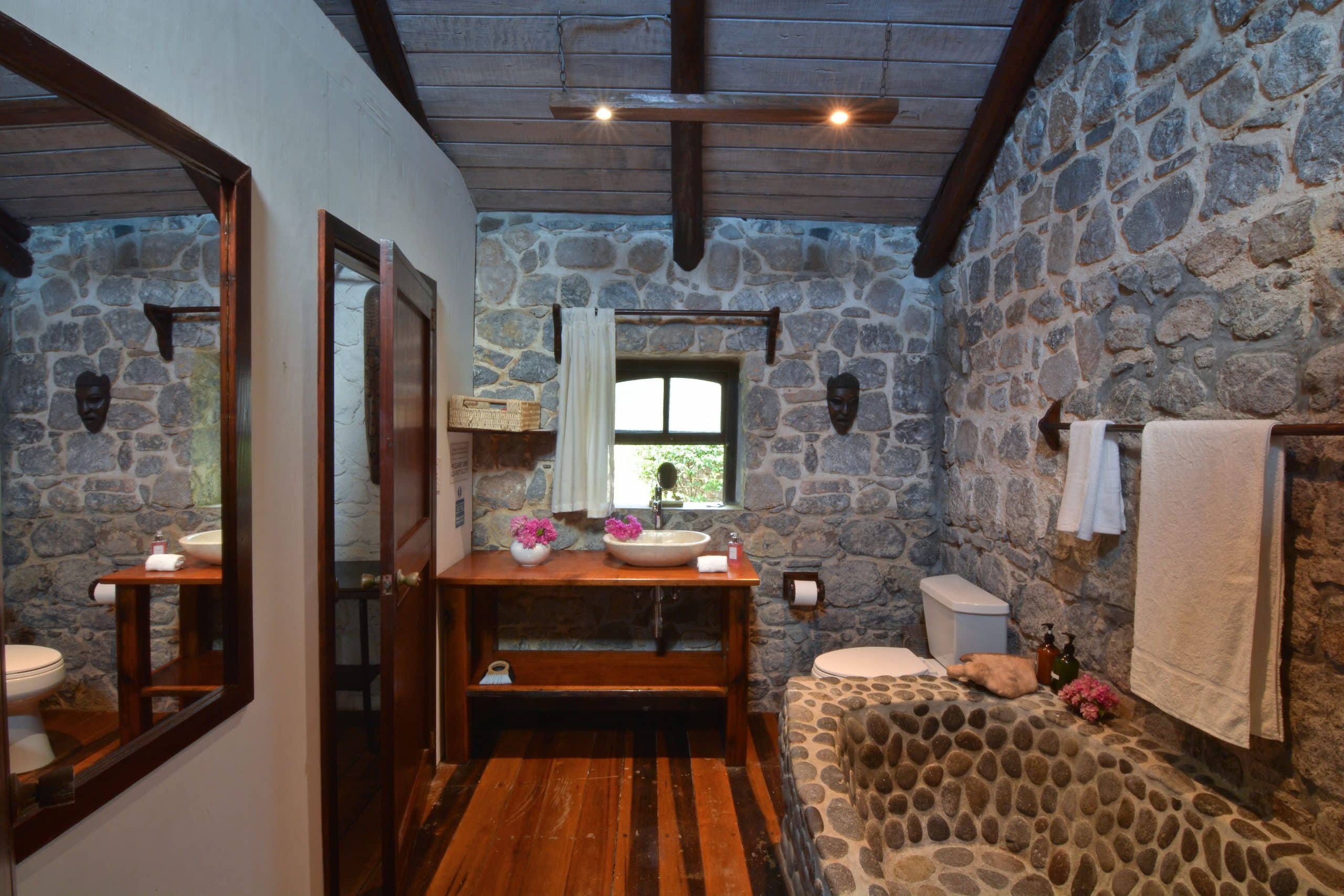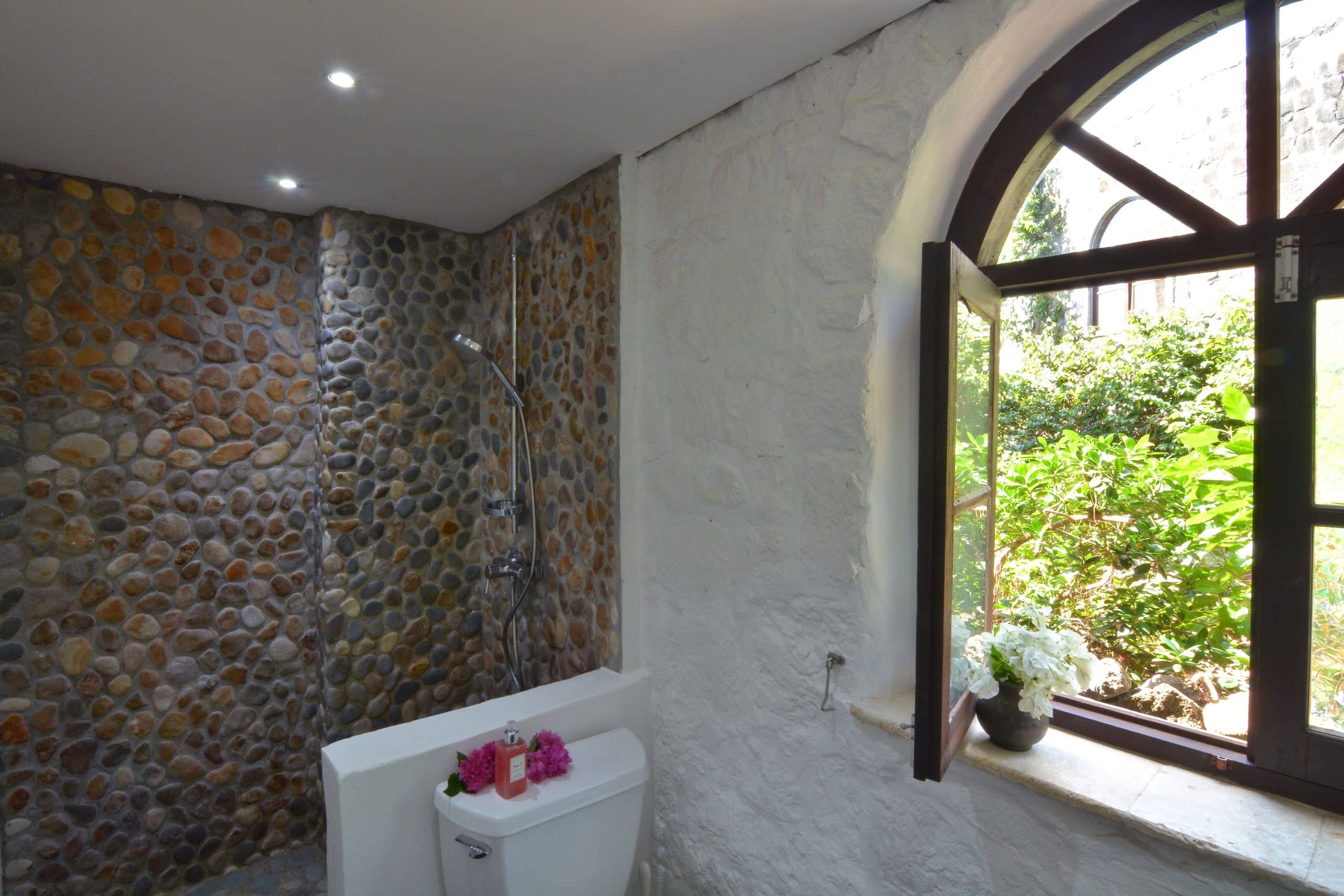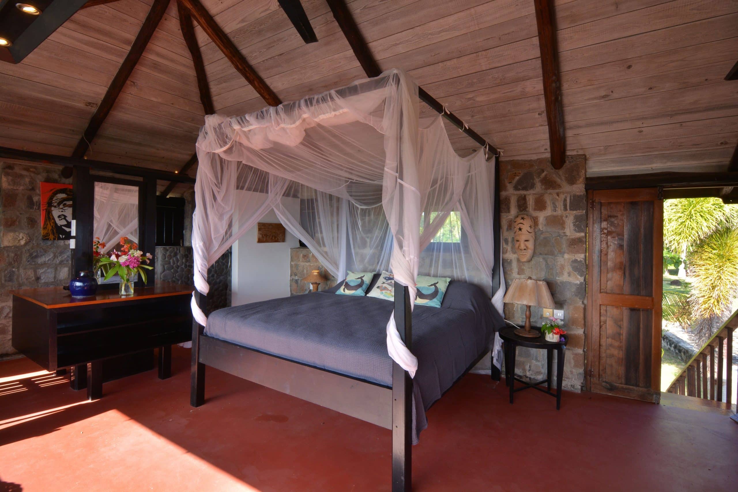 Five uniquely styled suites comfortably accommodate 12 guests. Two of the bedrooms are air-conditioned, the remaining rooms are very open and take advantage of the natural atlantic breezes. The two-bedroom primary suite is located on the second floor of the Old Fort building. This spacious suite features a large bedroom with a king-sized four-poster bed a second bedroom with a queen bed), a custom-designed bathroom with a pebbled bathtub, and a sitting room with a library. The suite boasts beautiful hardwood floors, high arched hardwood ceilings with ceiling fans, and two balconies with stunning views of the estate and the surrounding islands. This room has windows on two sides and is very open so have a wonderful breeze, this room does not have air conditioning